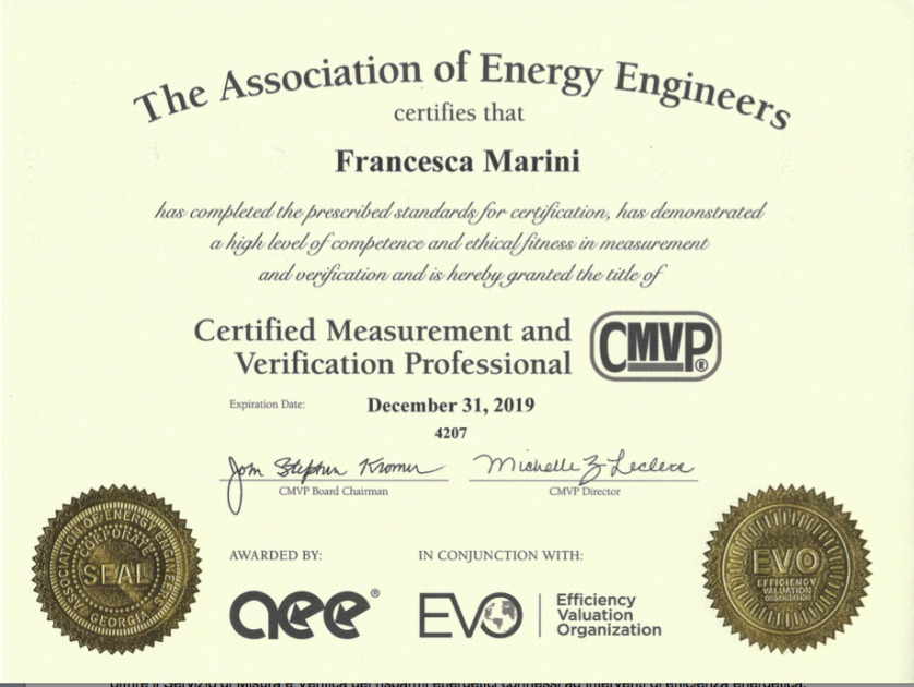 Raggiunto importante traguardo nella certificazione delle competenze dello Studio Ing. Marini che – avendo dimostrato un elevato livello di competenza nell’ambito della misura e verifica dei risparmi – ha completato l’iter standard di certificazione ed ha ottenuto la certificazione CMVP® Certified Measurement and Verification Professional.