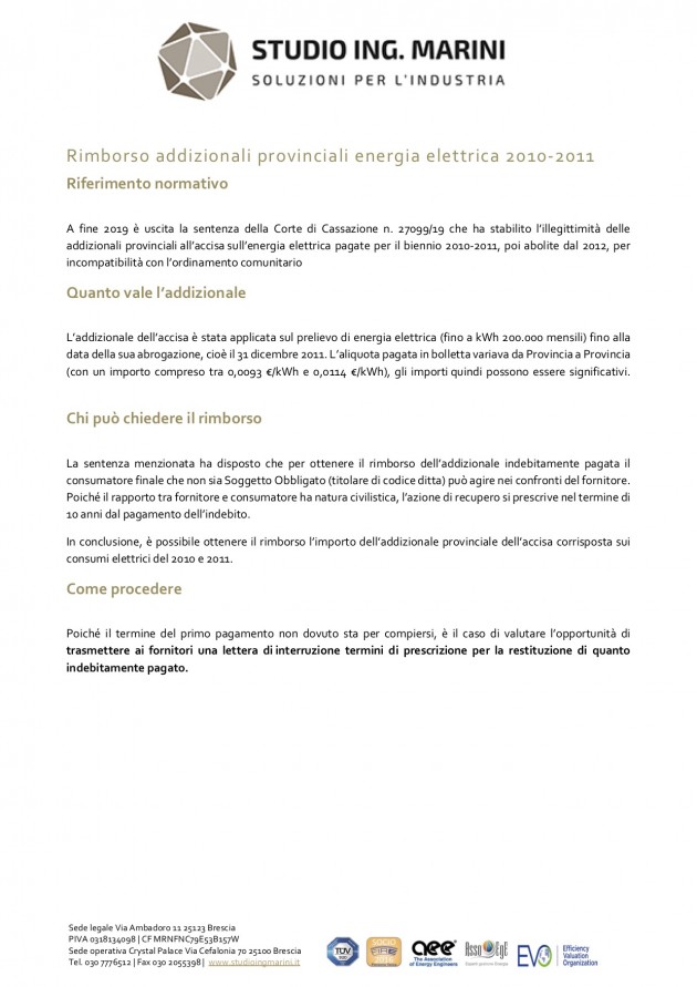 Tutte le aziende che abbiano pagato le addizionali provinciali sull’energia elettrica nel periodo 2010-2011 possono chiederne il rimborso al fornitore. Una volta verificata l’entita dell’importo (riportato in fattura), è necessario interrompere tempestivamente i termini di prescrizione con una lettera di messa in mora nei confronti dei fornitori. Lo Studio Ing. Marini è disponibile a fornire supporto ai clienti anche tramite uffici legali specializzati.
